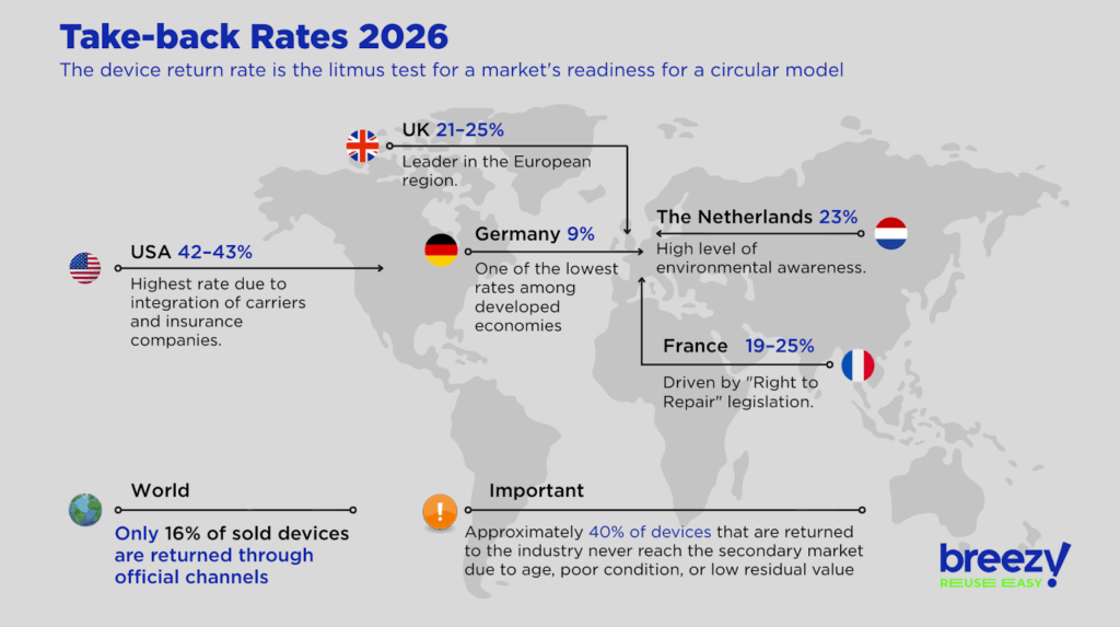 ◉ «Утечка» в неформальный сектор (90%): Почти 90% гаджетов либо уходят на серый рынок, либо пылятся в ящиках у владельцев. По данным Рикардо Чанга, средний уровень проникновения трейд-ина в Европе составляет всего 10% (в Германии — 9%). Саймон Брайант оценивает ежегодные потери в 1,2 млрд устройств, которые поглощаются неформальным сектором из-за недоверия к защите данных и низких оценочных выплат.